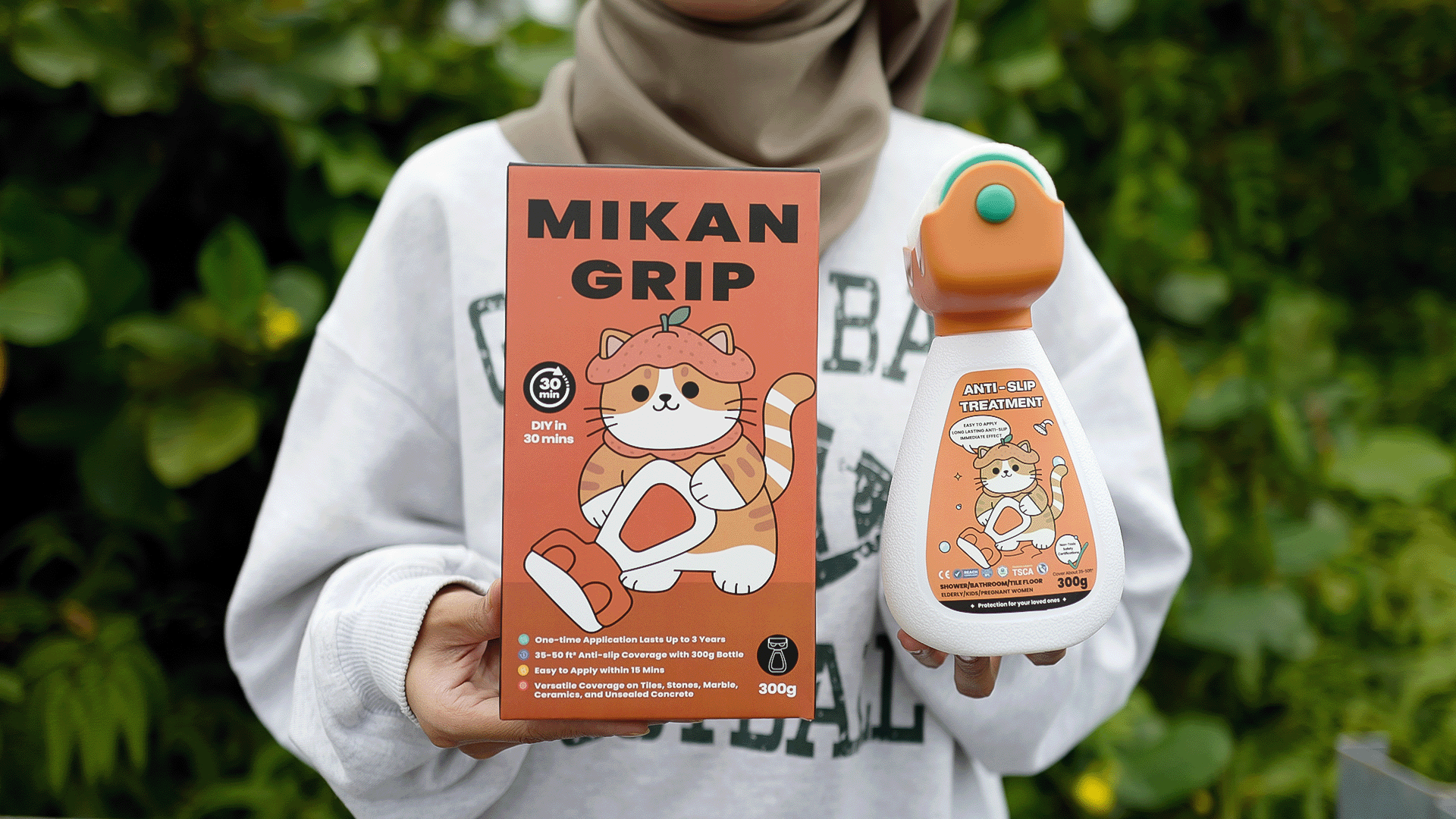Make floors safe with Mikan Grip, the best anti-slip treatment for tiles in Malaysia. Our innovative 2-in-1 design makes DIY so easy anyone can do it. One 300g bottle covers 3 bathrooms and lasts up to 3 years. SIRIM tested for instant grip on wet floors to confirm no more slipping and no toxic substance!